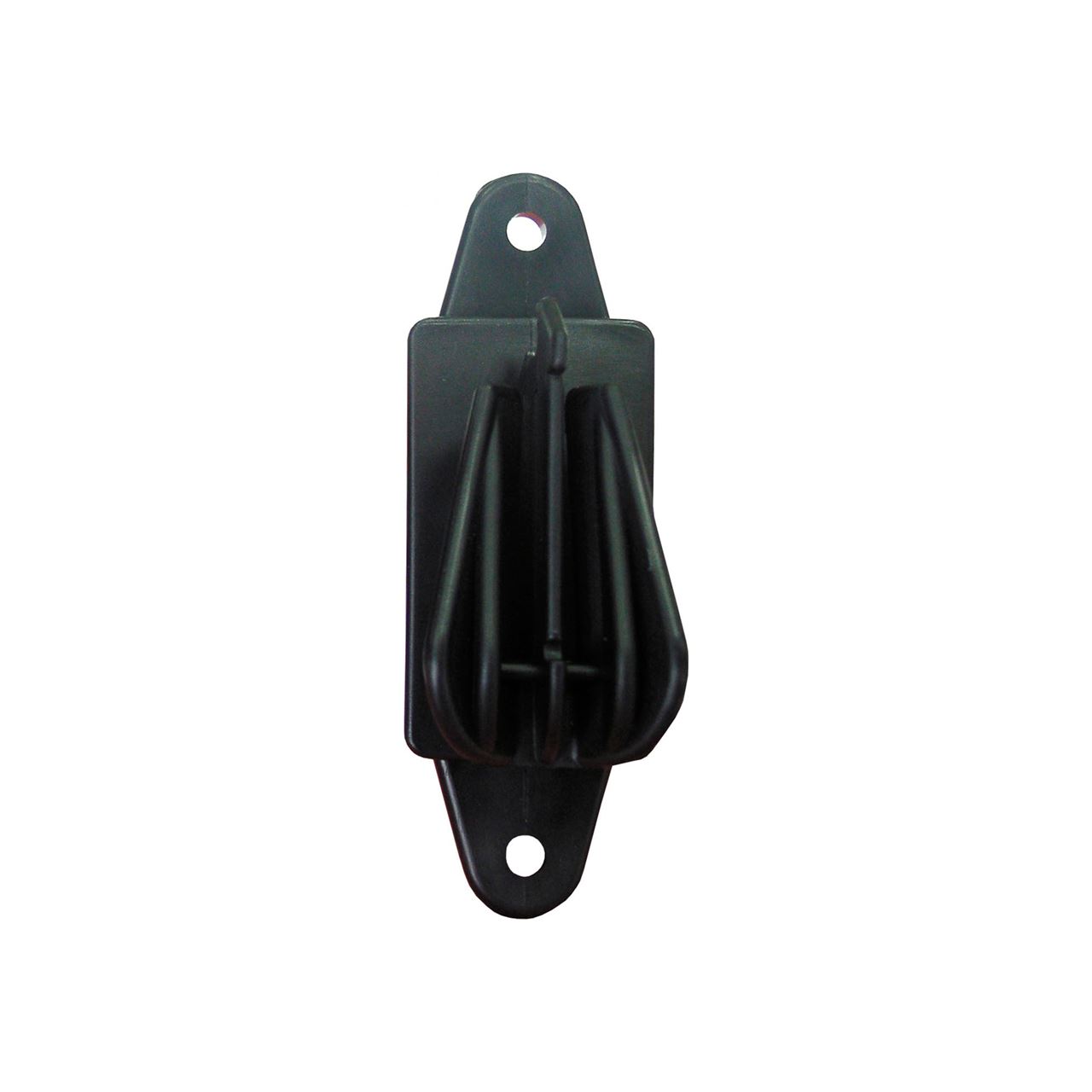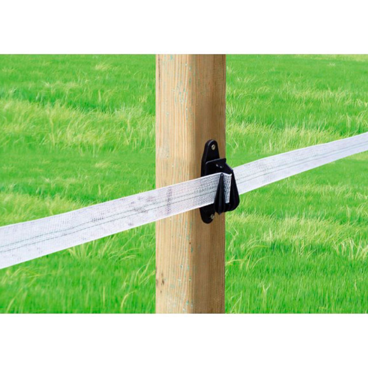 Aislador con 2 amarres para la sujeción de la cinta pastora de hasta 40 mm en poste de madera.