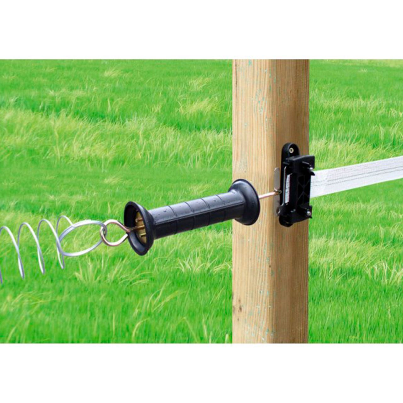 Aislador final/cierre y puerta para cinta pastora en poste de madera.