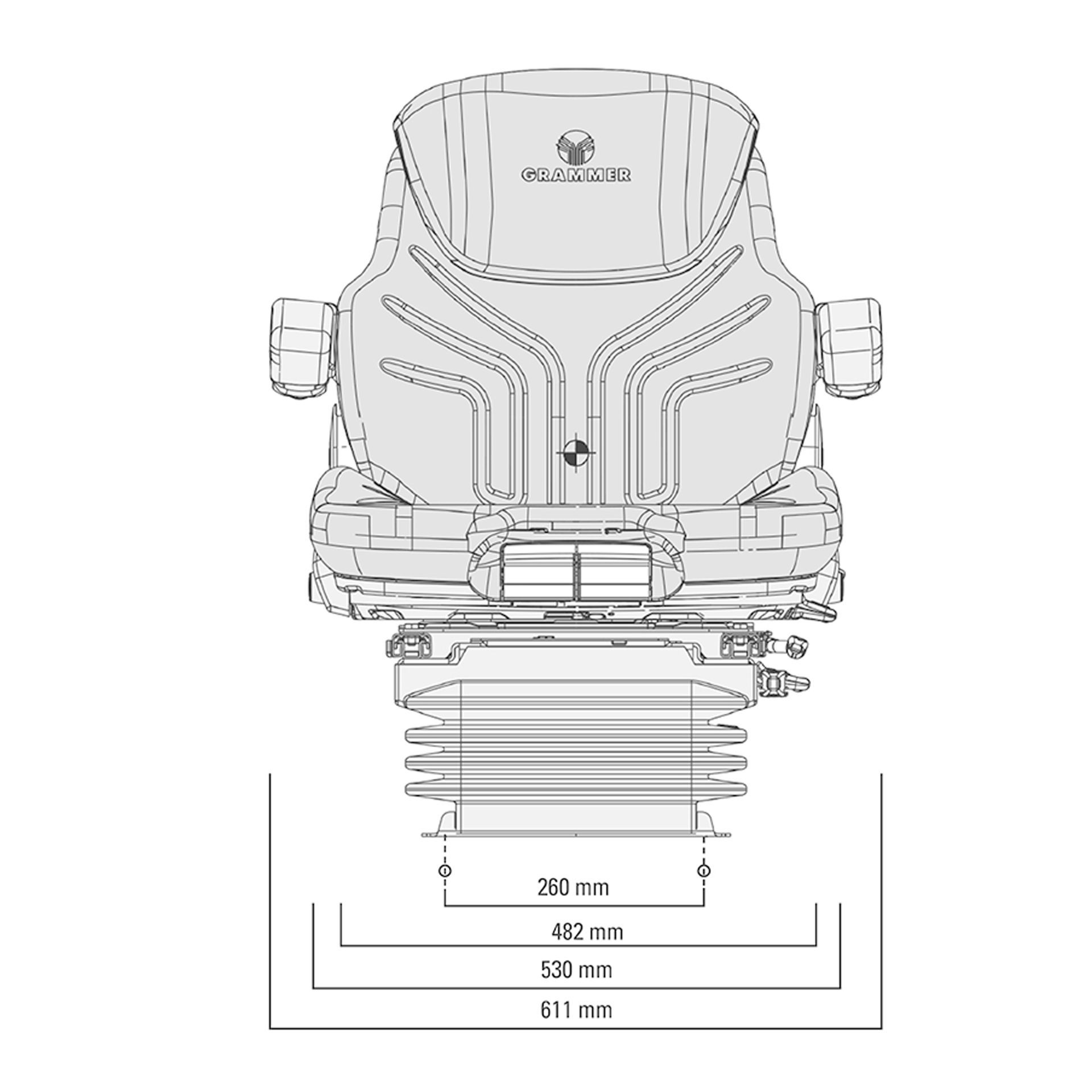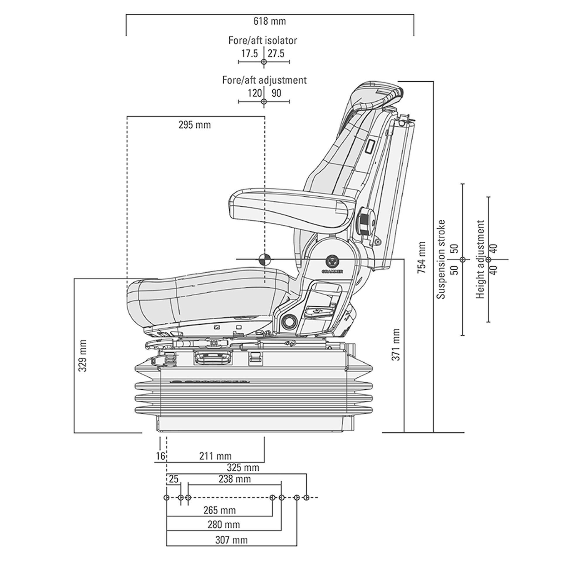 El asiento Grammer Maximo Comfort Plus equipado con suspensión neumática dispone de apoyabrazos regulables y plegables, prolongación de respaldo integrada y regulable y soporte lumbar mecánico.