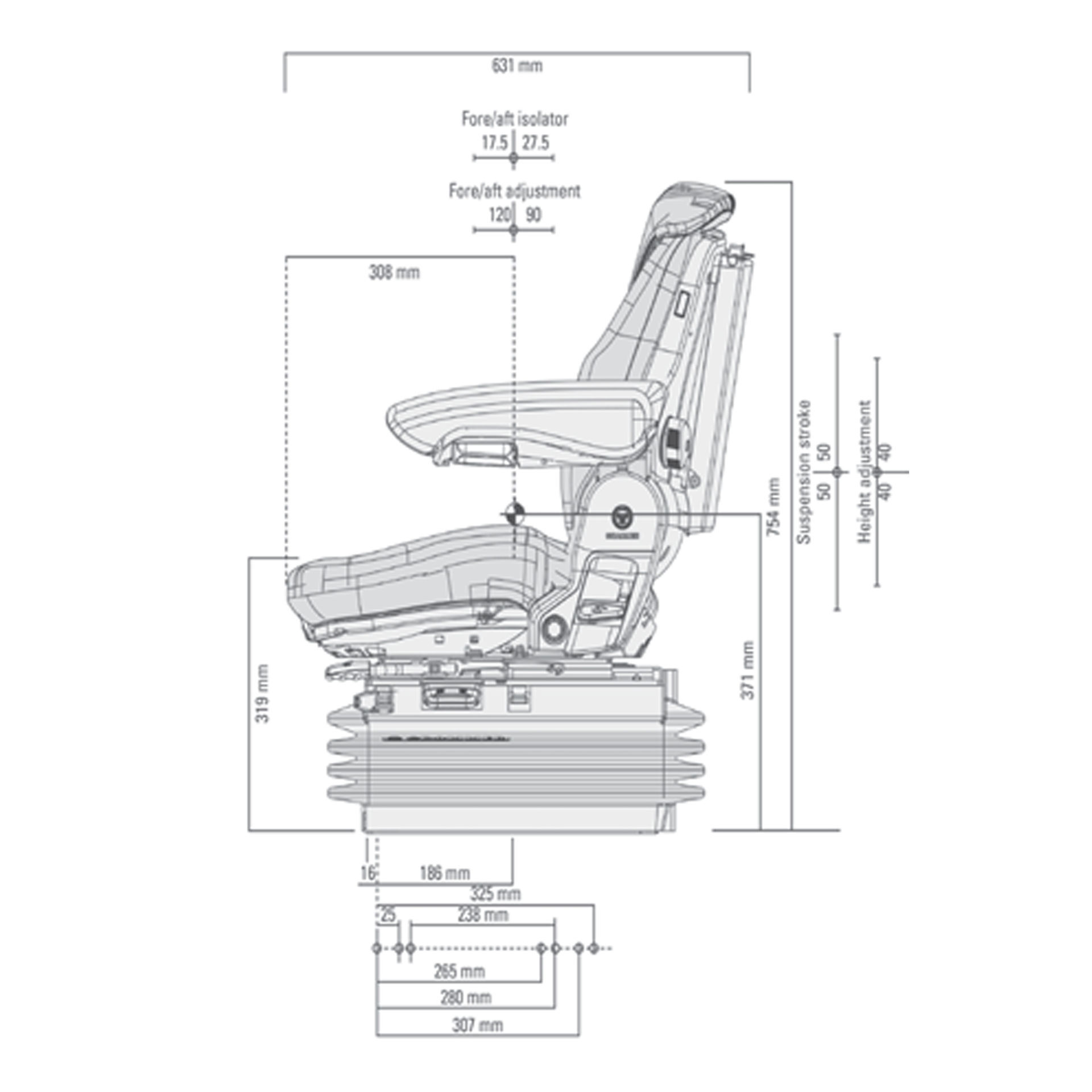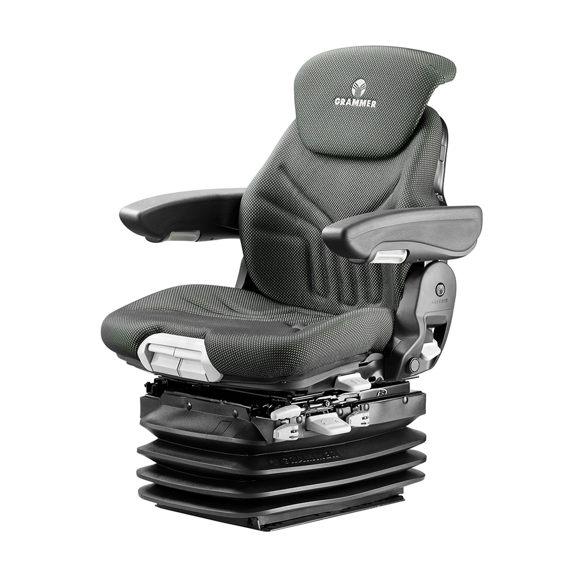 Suspensión de baja frecuencia que absorbe las vibraciones, los posibles golpes cervicales y previene rebotes del asiento en situaciones críticas como resultado del incremento de las vibraciones consecuentes a la resonancia.
