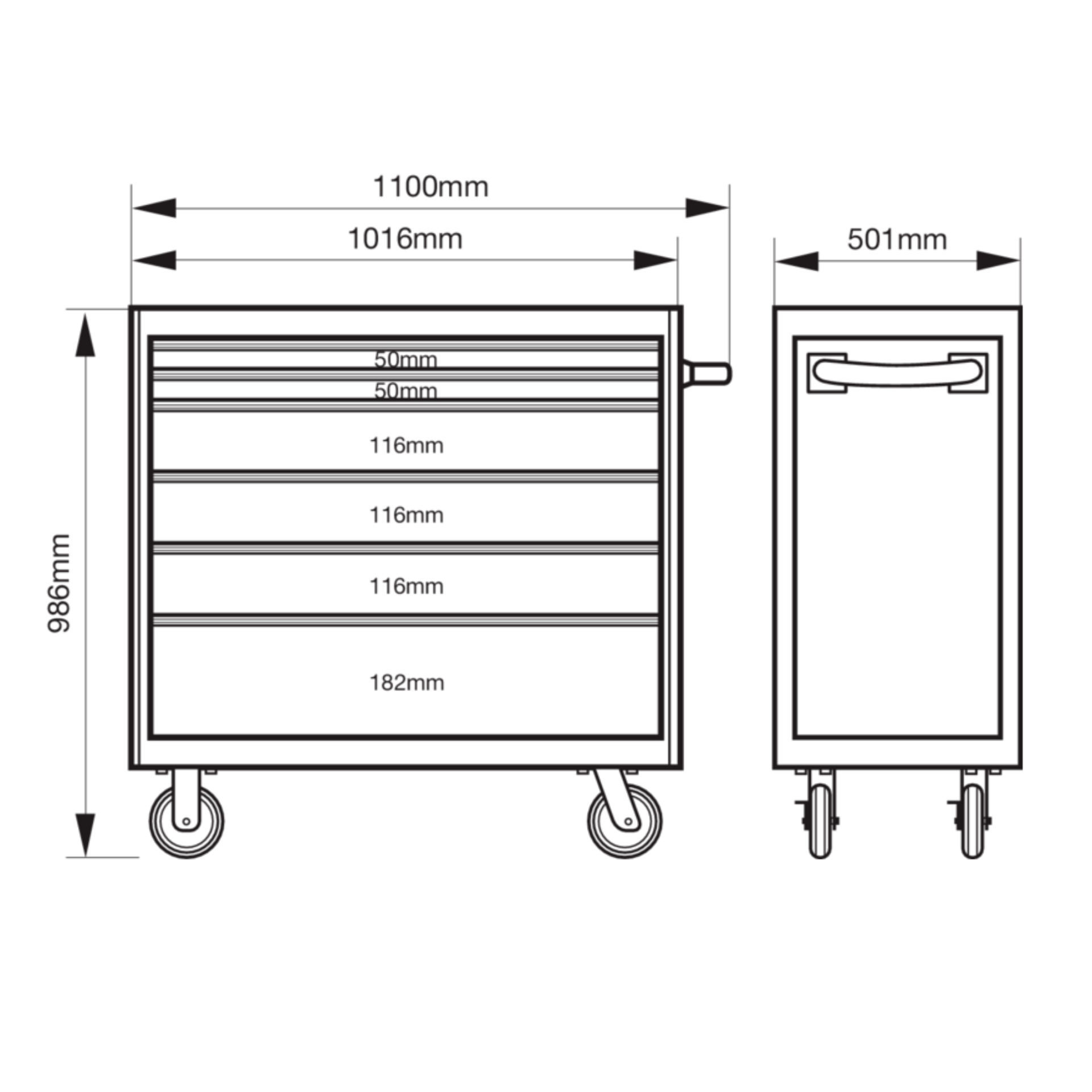 Carro de herramientas profesional Bahco extragrande con 6 cajones, diseñado para almacenaje móvil de herramientas y equipos en talleres mecánicos, industriales o entornos de mantenimiento exigentes.