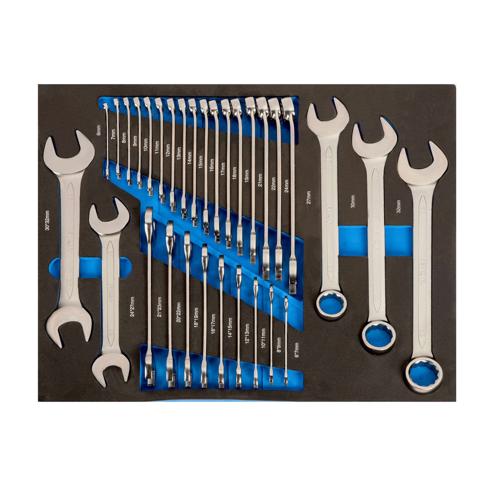 Foam 3/3 con herramientas (31 piezas). Llaves combinadas y llaves fija de dos bocas. Llaves combinadas: de 6 a 32 mm. Llaves fijas de dos bocas: 6-7 a 30-32 mm.