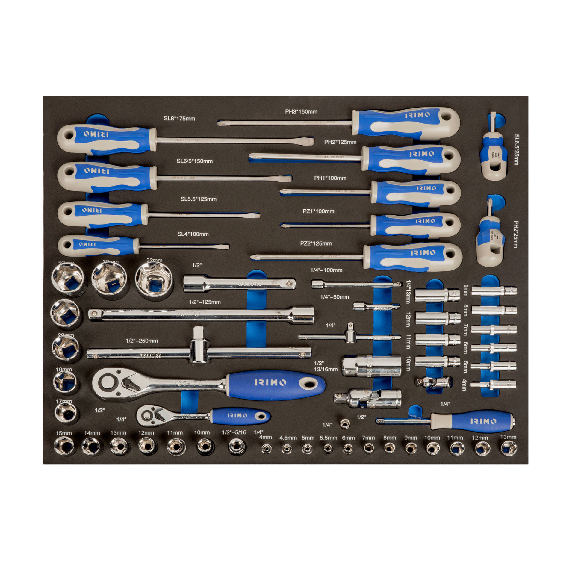 Foam 3/3 con herramientas (60 piezas). - Juego de vasos hexagonales de 1/2" y 1/4"; Destornilladores Phillips, ranurados y Pozidriv; Carracas y accesorios. Vasos de 1/4": normales y de impacto, ambos de 4 a 13 mm. Vasos de 1/2": de 10 a 32 mm. Carracas reversibles de 1/4" y 1/2". Accesorios para vasos. Destornilladores ranurados: para ingeniería (4-100, 5,5-125, 6,5-150 y 8-175) y Stubby (6,5-25). Destornilladores Phillips: para ingeniería (1-100, 2-125 y 3-150) y Stubby (2-25). Destornilladores Pozidriv (1-100 y 2-125).