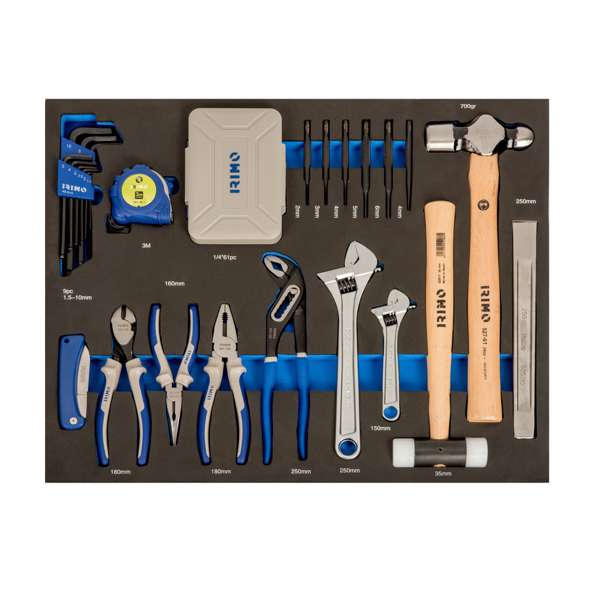 Foam 3/3 con herramientas (87 piezas). -Herramientas de golpeo y corte; llave ajustable "inglesa"; cinta métrica; alicates; llaves y juegos de puntas. Herramientas de golpeo: martillo con boca de nailon y martillo de bola; cincel de chapista; botador y granete. Alicates: combinados, de boca semirredonda, de corte diagonal y tenaza articulada. Juego de puntas. Juego de llaves tipo allen. Llave ajustable "inglesa".Navaja para electricistas. Cinta métrica.