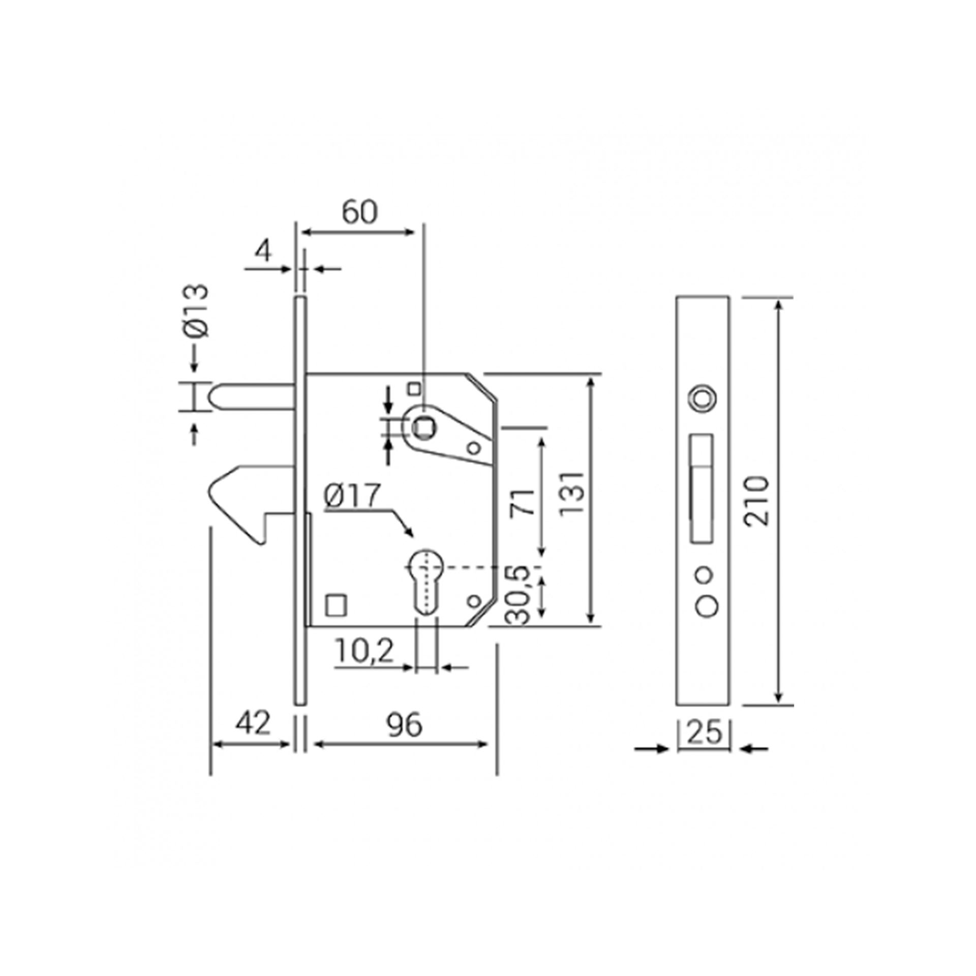 Cerradura pico loro de 60 sin cilindro para embutir en puertas correderas.