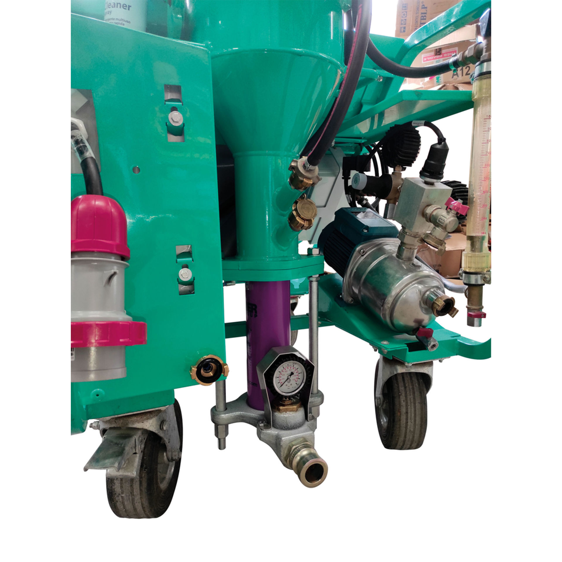 Incluye 20 metros de cable eléctrico de 4 x 5 mm. con clavija 3P+N+T rojo, adaptador de 400 V 32 A trifásico rojo a 230 V 16 A monofásico azul, adaptador de 400 V 32 A trifásico rojo a 230 V 32 A monofásico azul, 40 metros de manguera para el agua, 15 metros de manguera para materiales Ø 25 mm interior, con acoplamiento rápido, 16 metros de manguera para el aire Ø 13 mm interior, con acoplamiento rápido, caja de accesorios con proyector y toberas, rascador y bola de esponja para limpieza de las mangueras de materiales., libro de instrucciones, despiece y Certificado CE.