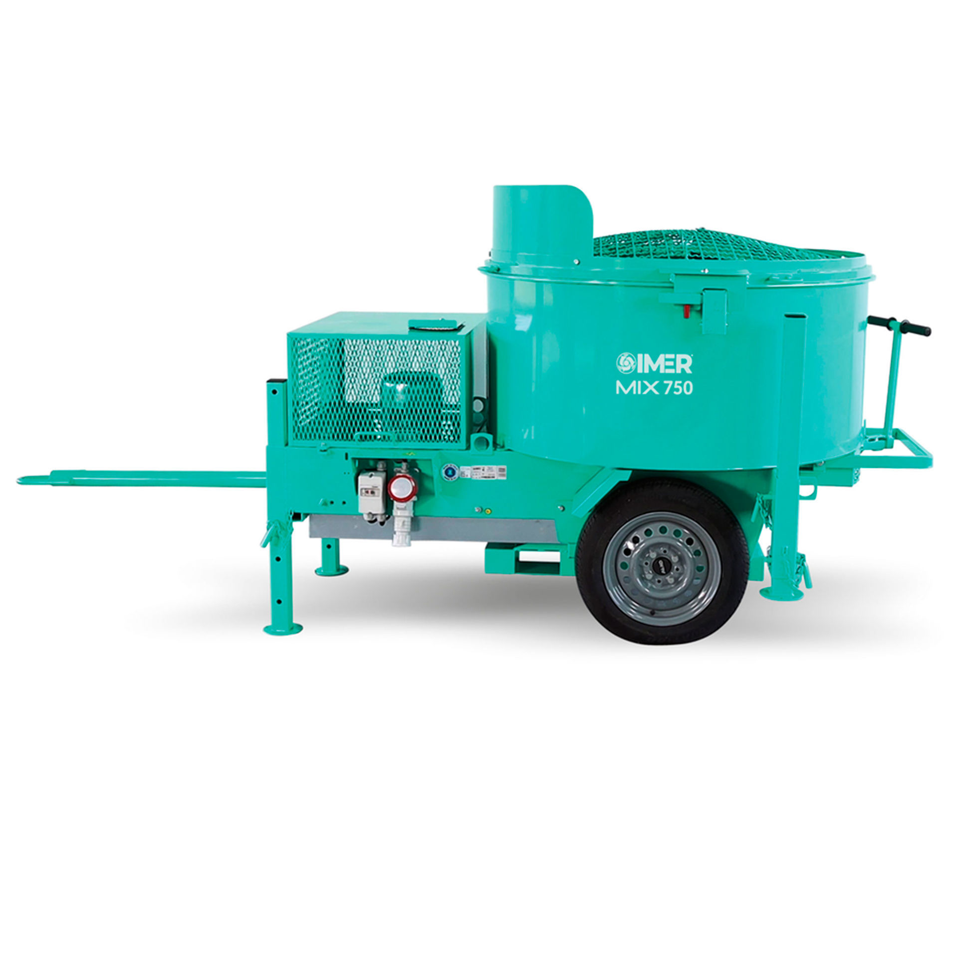 Mezcladora de mortero planetaria profesional con 750 litros de capacidad, motor trifásico de 4 kW, alta maniobrabilidad y sistema PAT “Push And Turn” de cierre hermético, fácil y seguro.