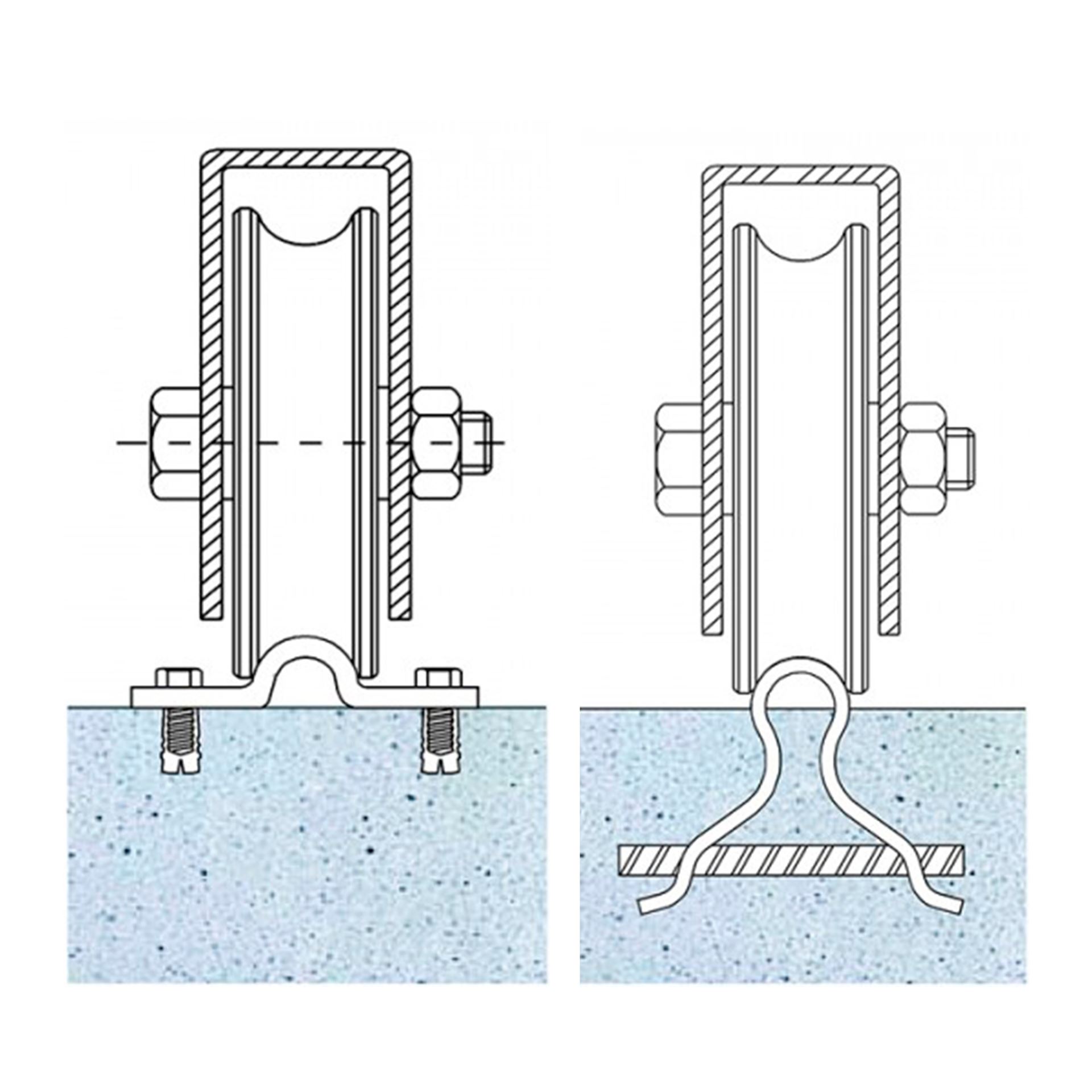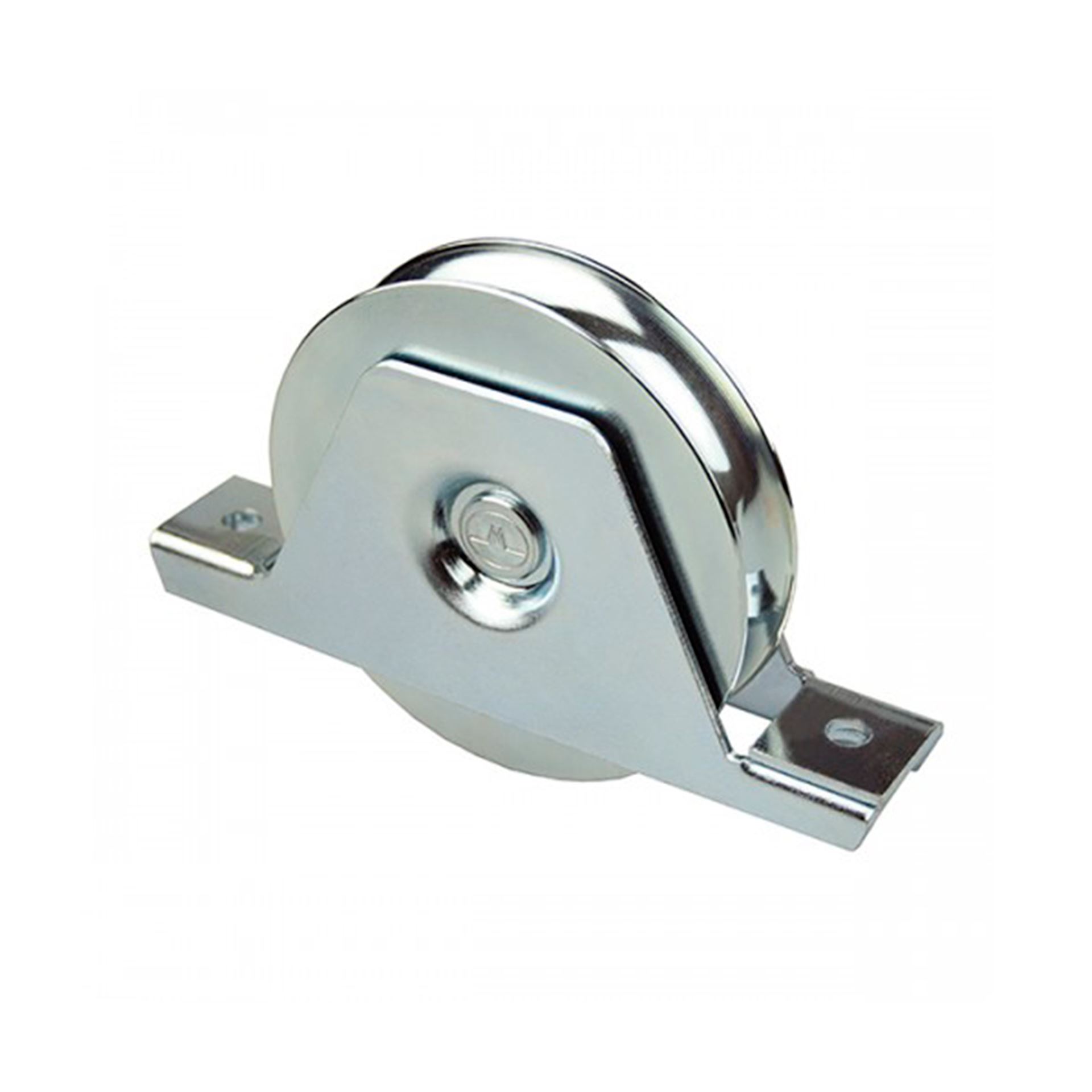 Polea de un rodamiento con soporte y canal redondo para atornillar en corredera inferior.