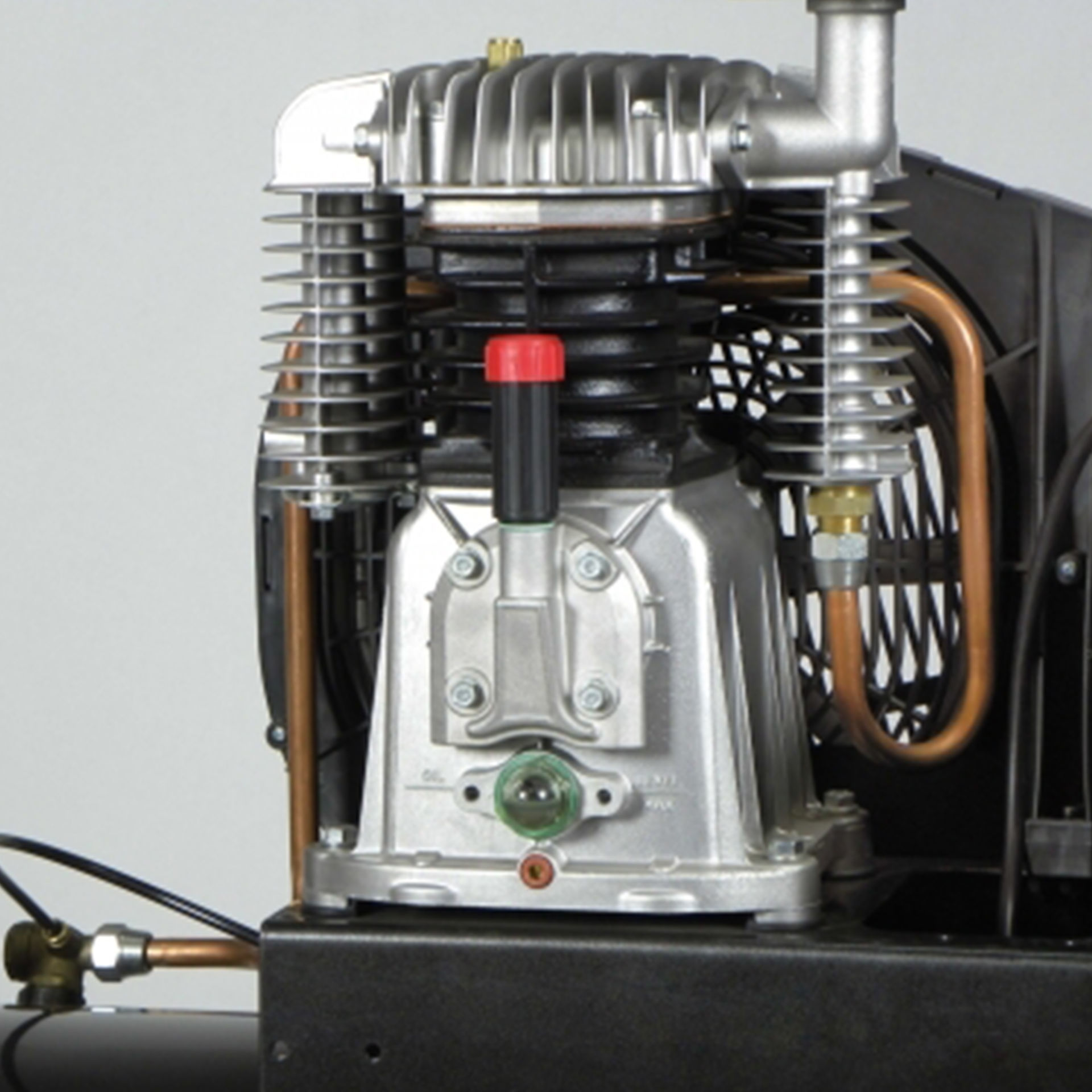 Grupo cabezal de doble etapa con cilindro de hierro dotado de amplios colectores entre etapas y posterior aleteado para mayor refrigeración.