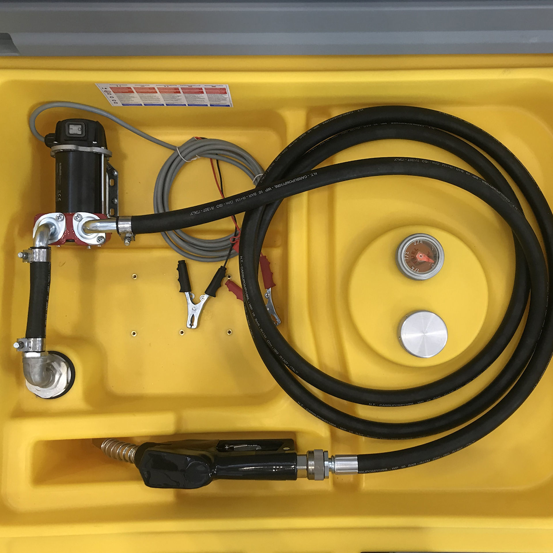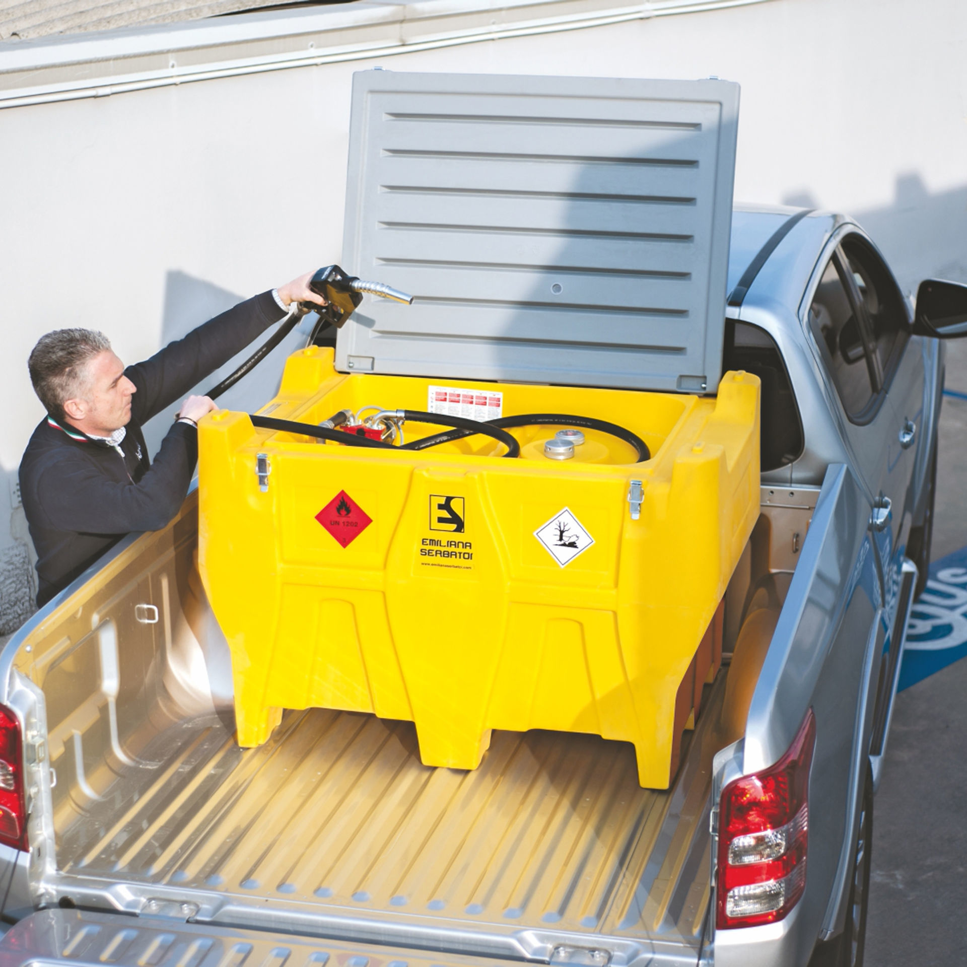 Equipado con: tapa bloqueable con candado, tapón de carga de aluminio, válvula de seguridad, indicador de nivel, filtro en línea, grupo de transvase, pistola  automática, orificios para la elevación a plena carga con carretilla elevadora, asas para la elevación sin carga y alojamientos para la colocación de correas de fijación en la base de apoyo.