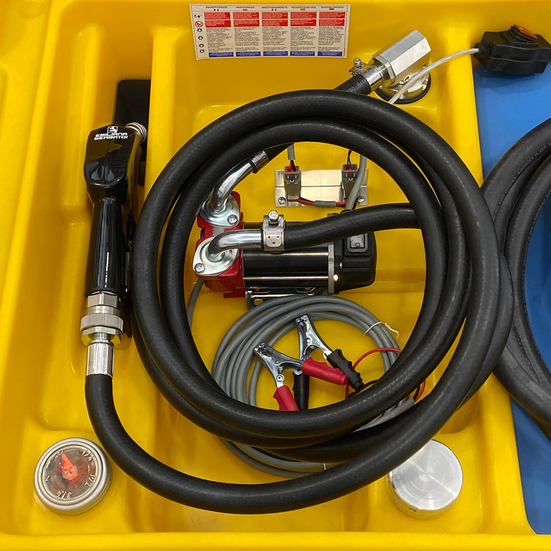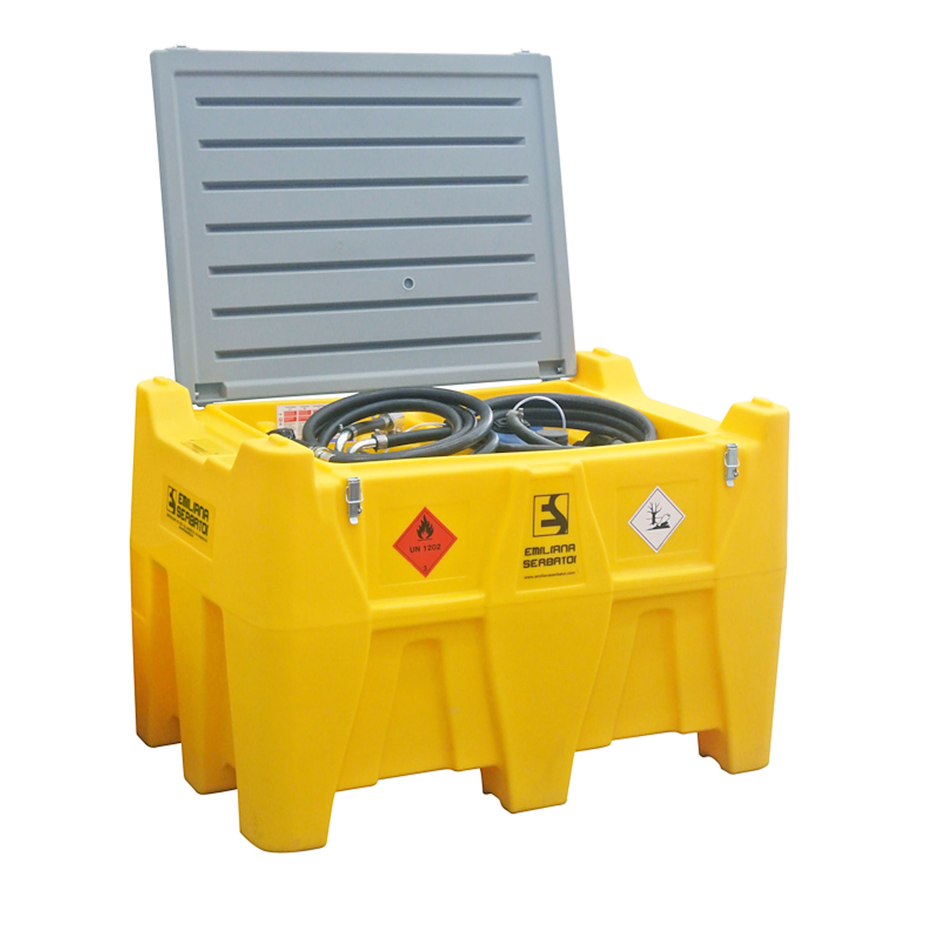Válvula de seguridad, grupo de transvase, orificios para elevación utilizando carretillas elevadoras con carga completa, asas de elevación en vacío y alojamientos para colocar las correas de fijación en la base de apoyo.
