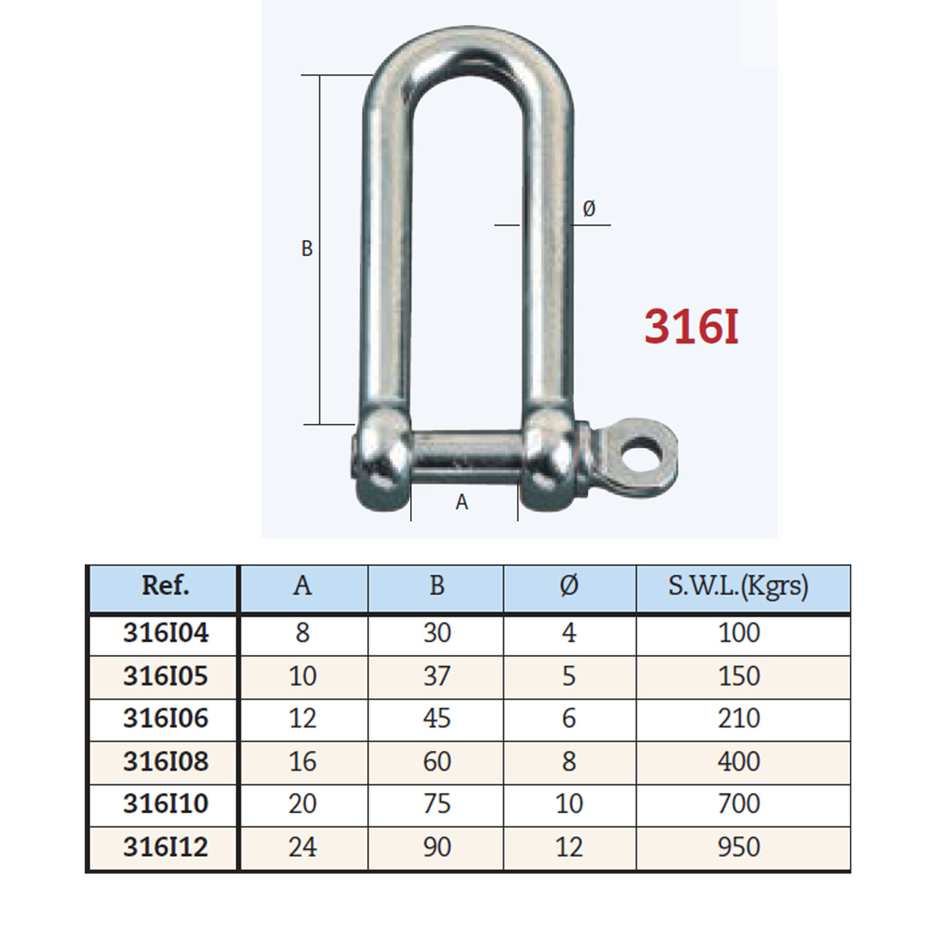 Grillete largo fabricado en acero inoxidable.