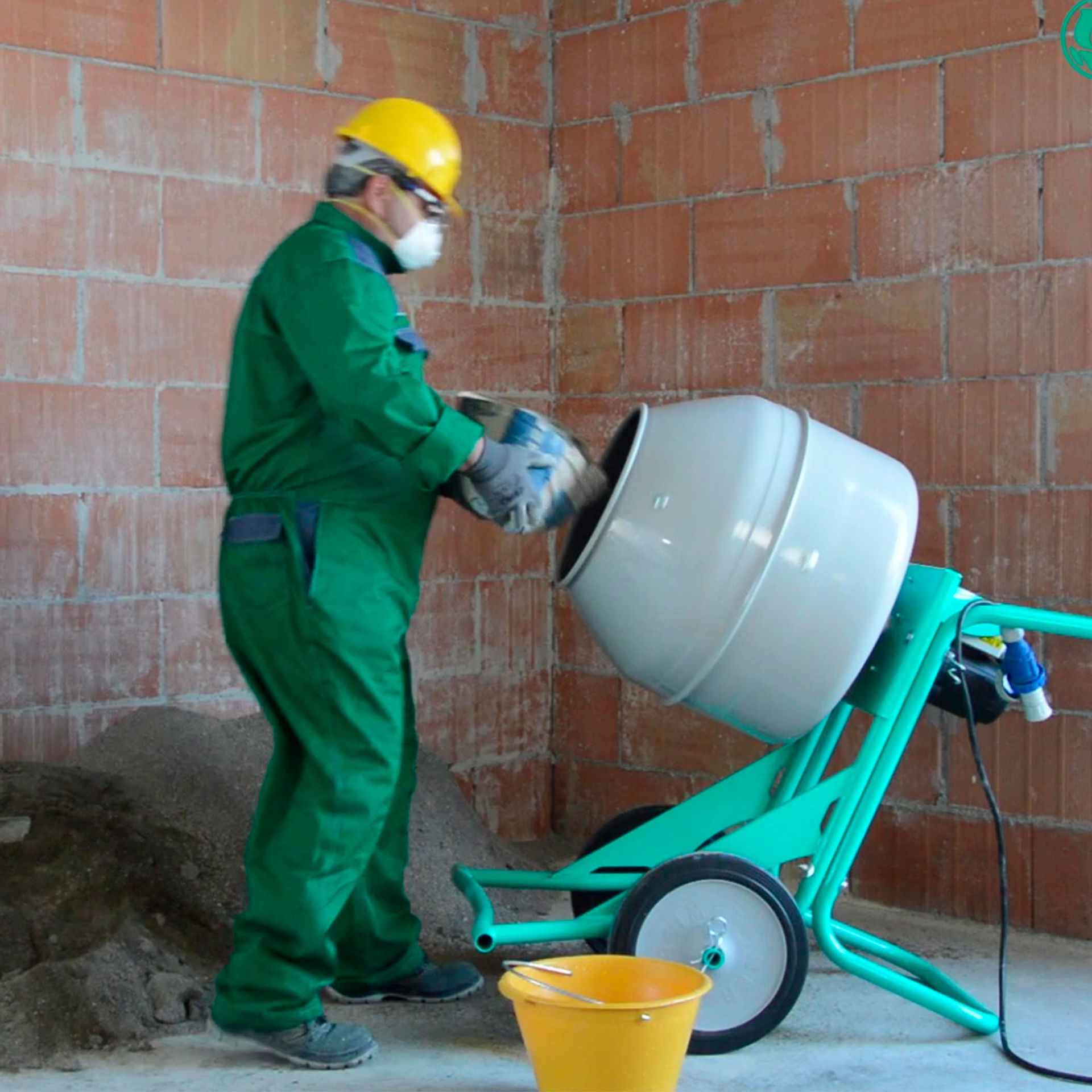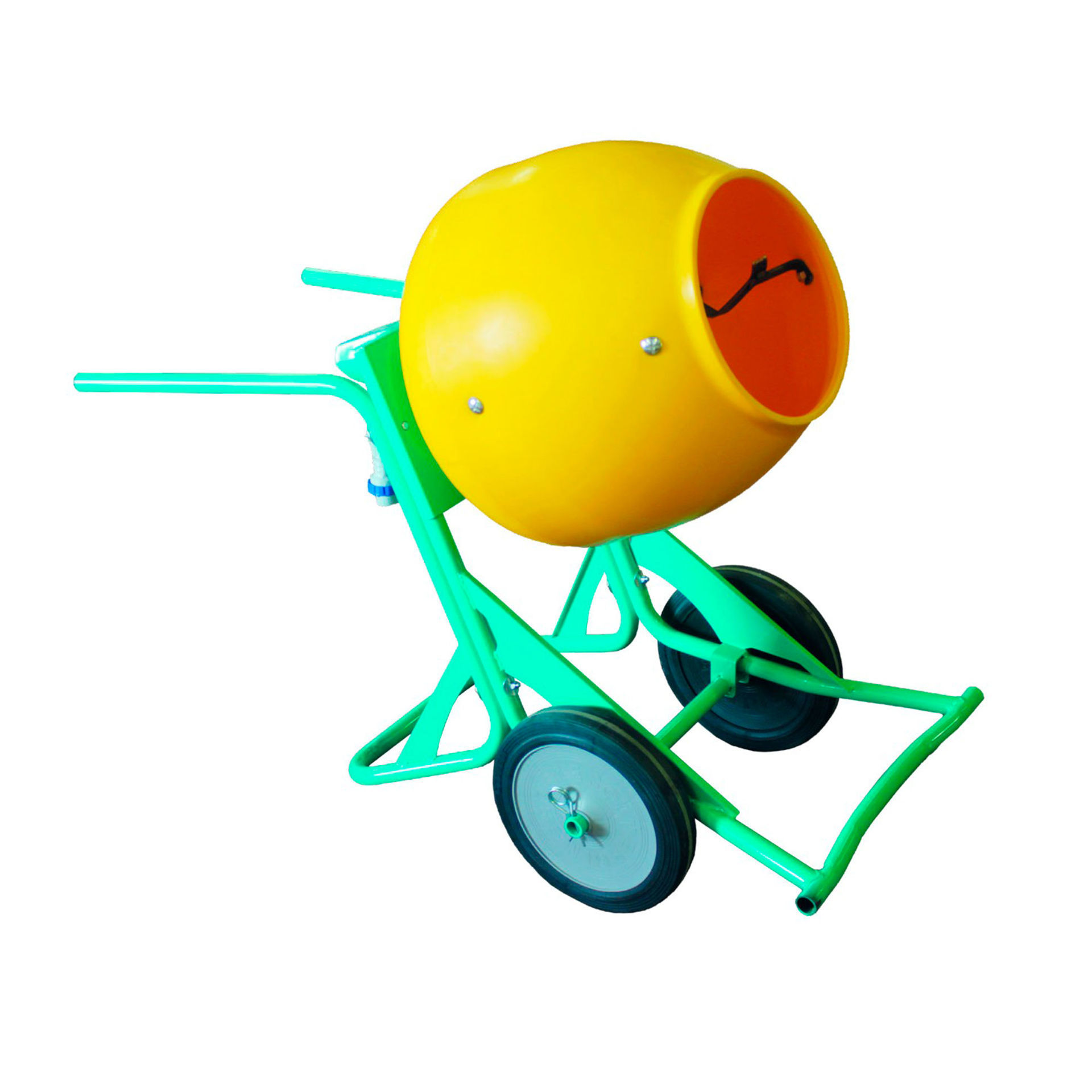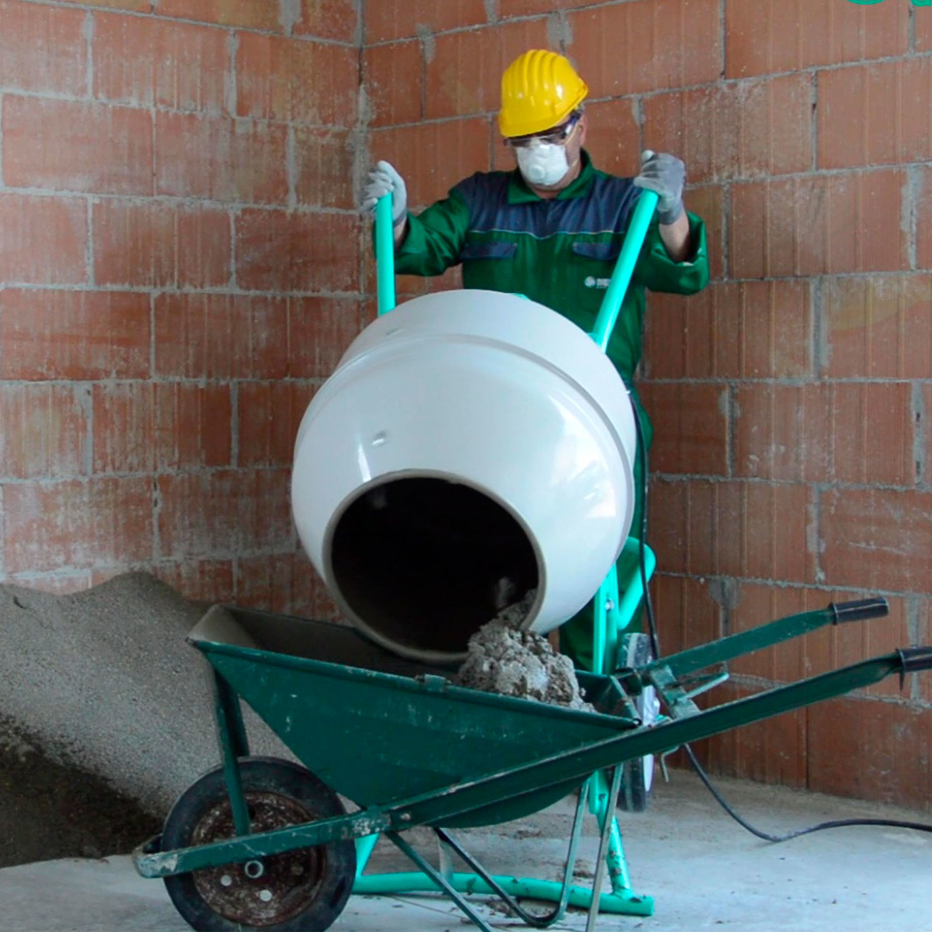 La cuba está sobreelevada sobre un chasis, permitiendo bascular la mezcla sobre un carro chino o sobre una carretilla.