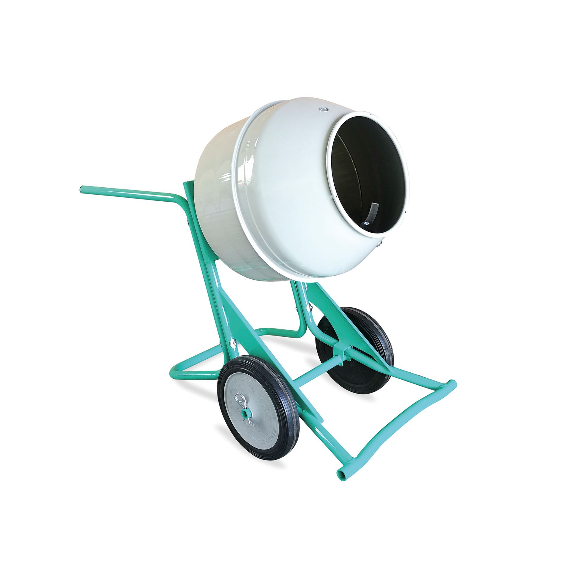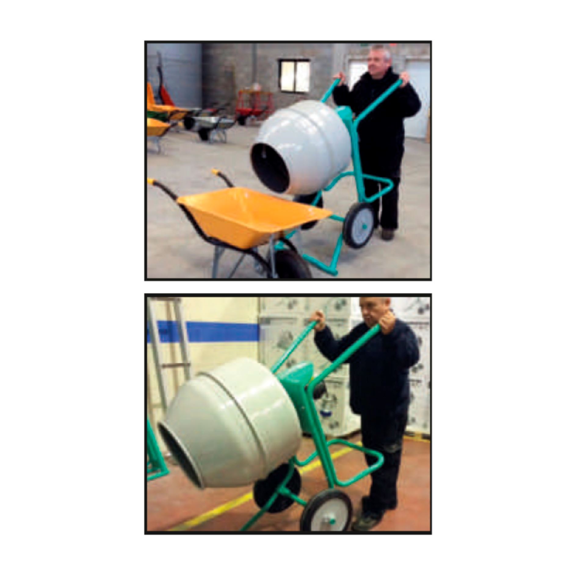 La cuba está sobreelevada sobre un chasis, permitiendo bascular la mezcla sobre un carro chino o sobre una carretilla.