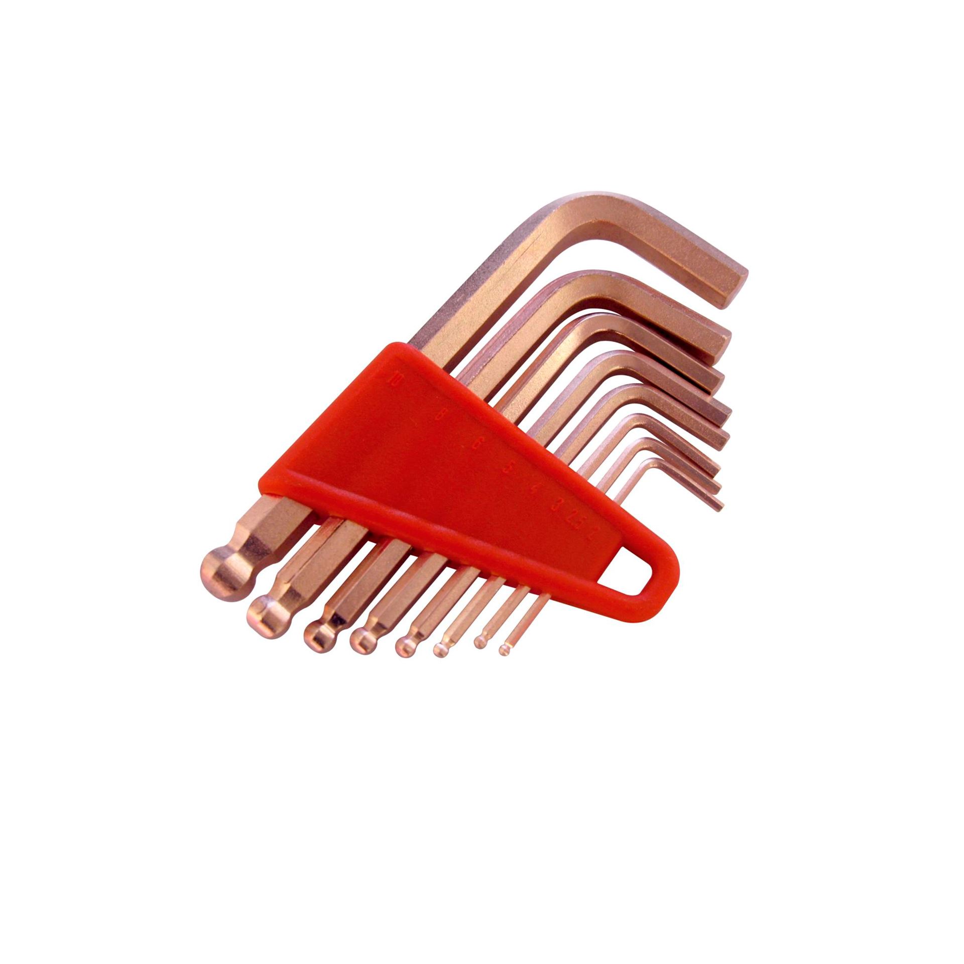 Juego compuesto por 8 llaves allen con bola antichispas, antimagnéticas y muy resistentes a la corrosión.