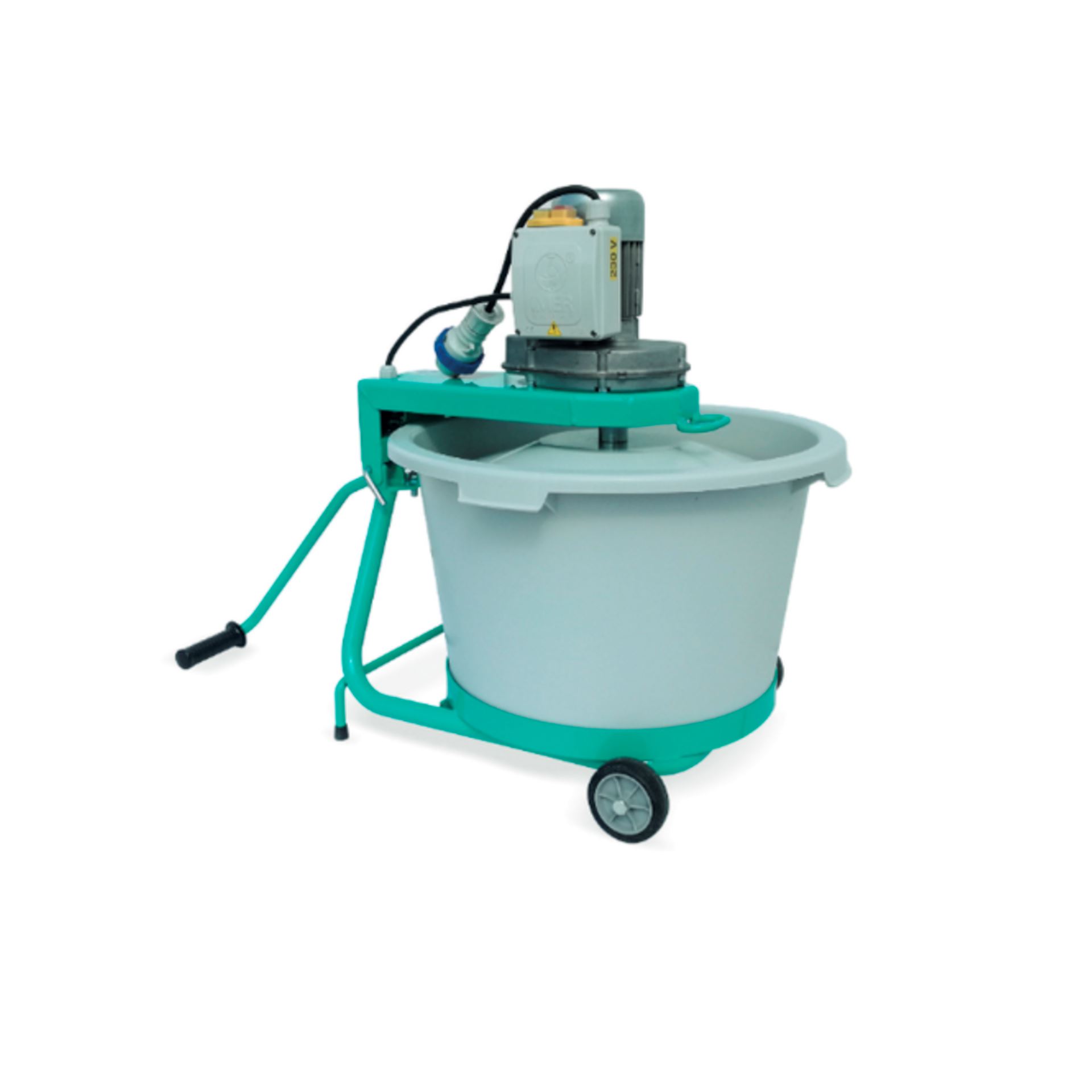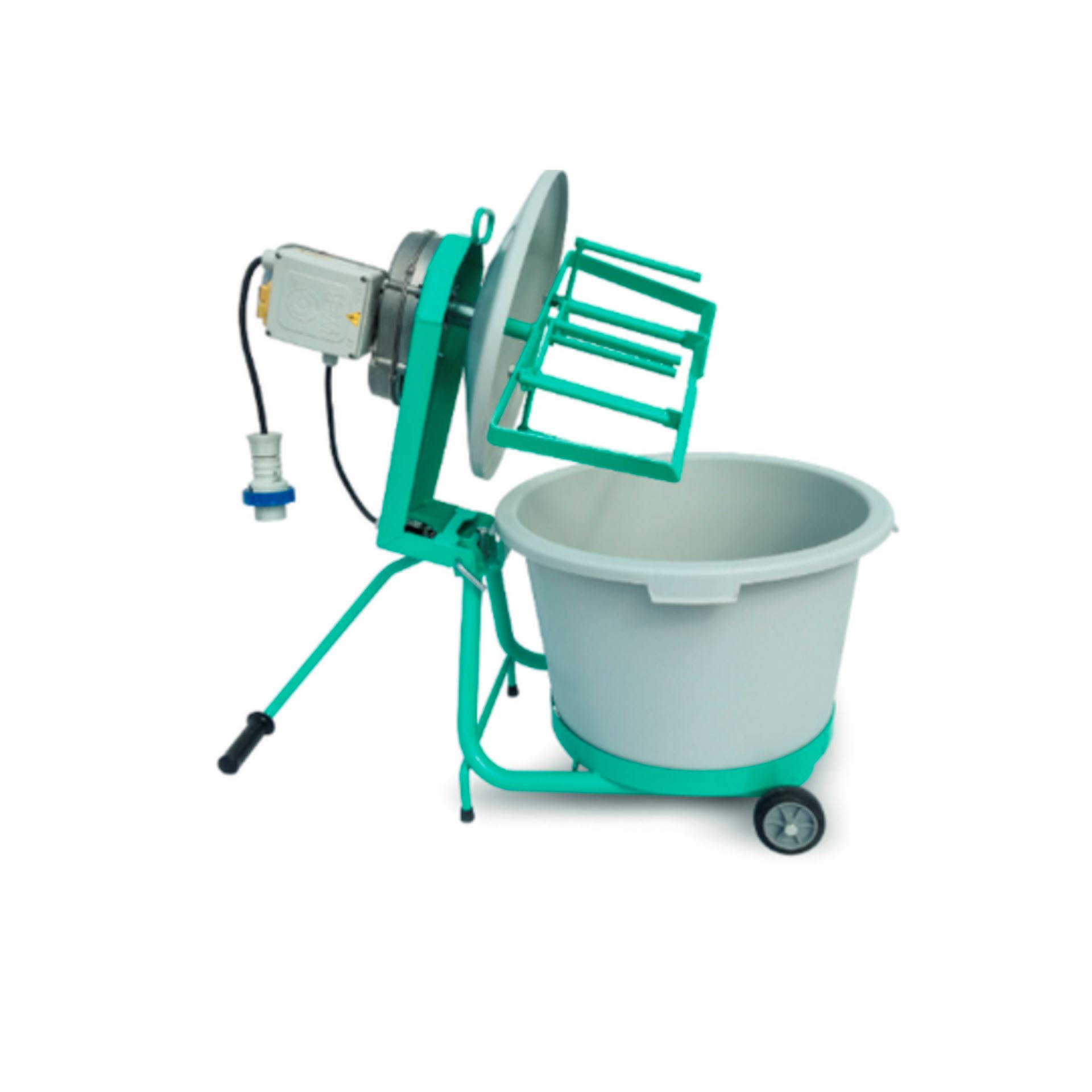 Mezcladora de mortero monofásico de 550 W con capacidad de la cuba de 56 litros, para mezclar perfectamente todo tipo de materiales de gramulometría fina (yesos, resinas, morteros, cemento, cola...).