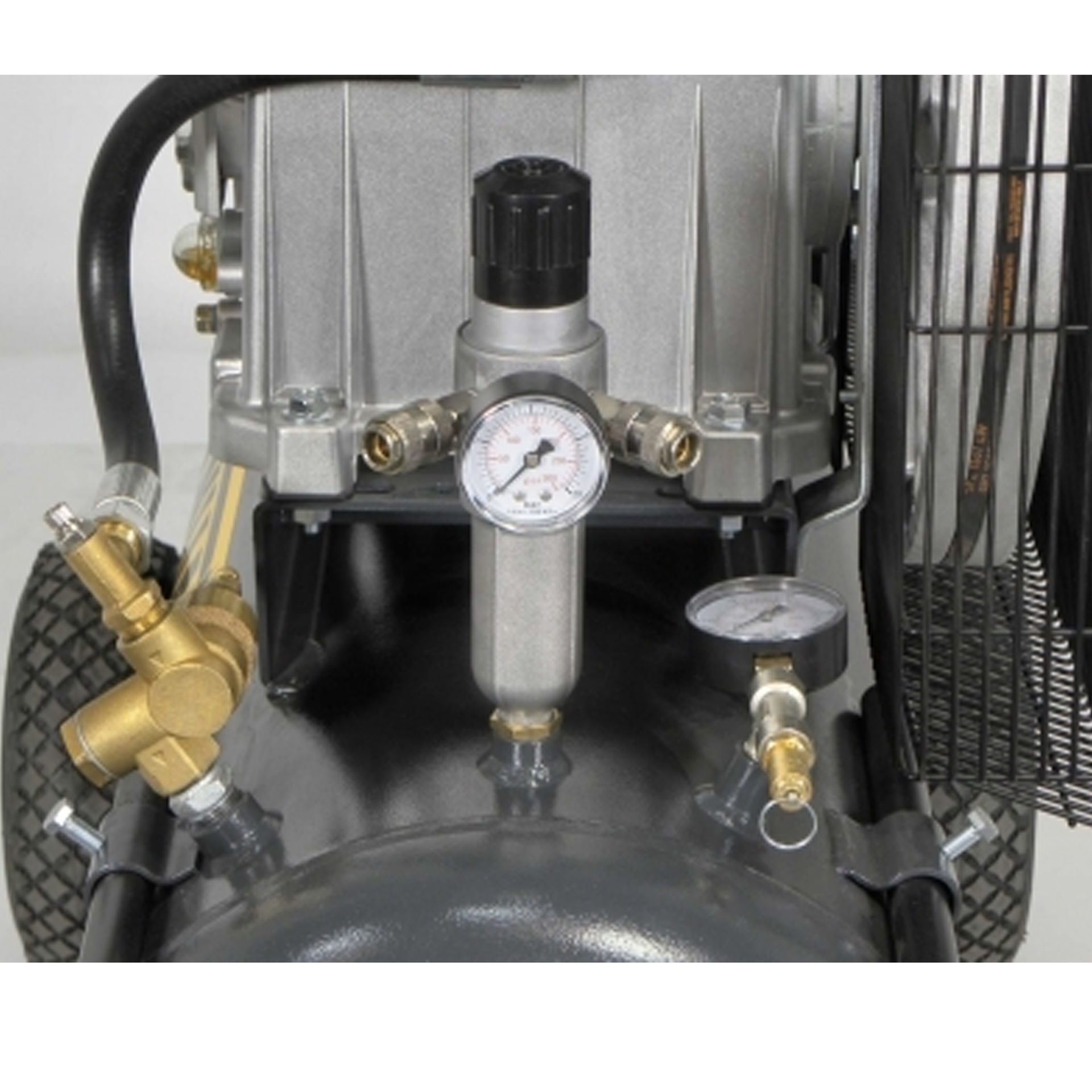 Compresor de pistón de gasolina con ruedas sobre doble depósito.