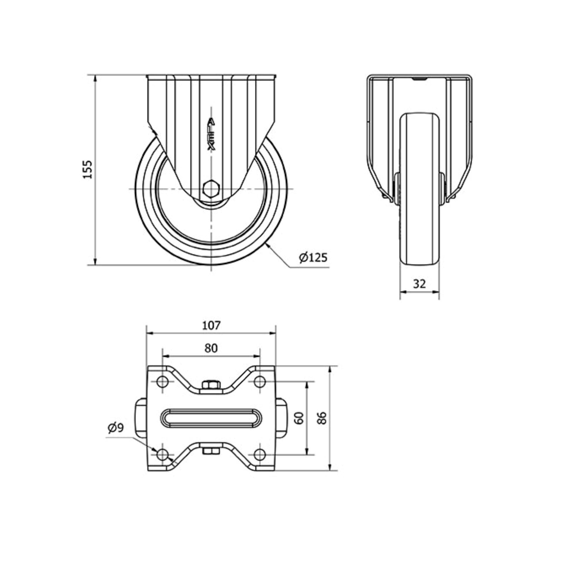Rueda fija poliuretano 125 mm 200 Kg sin freno Alex INOX